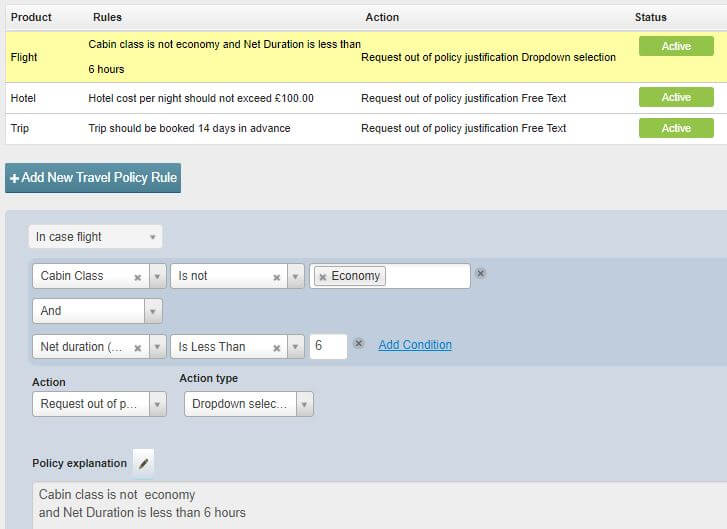 A comprehensive travel policy will include information for International and Domestic travel, you can set limits based on duration of travel for example- Economy for Domestic and European flights and business class on flights over 8 hours.